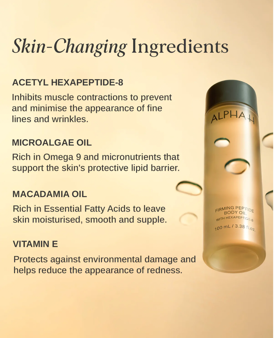 Massage Firming Peptide Body Oil into clean, damp skin, paying particular attention to areas you would like to nourish, smooth and firm.