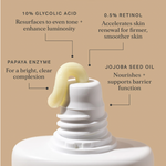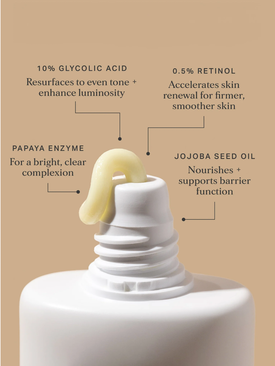 HERO INGREDIENTS: 0.5% Retinol, 10% Glycolic Acid, Sweet Almond Oil, Panthenol (Vitamin B5), Papaya Enzyme