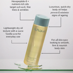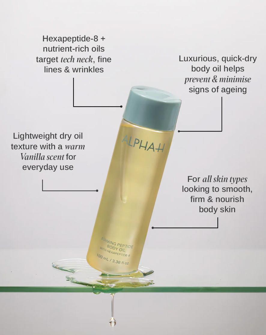 More than a traditional body oil, this daily high-performance treatment targets visible signs of ageing including tech neck, lines, wrinkles, dryness, dehydration, sun damage and crepey skin.