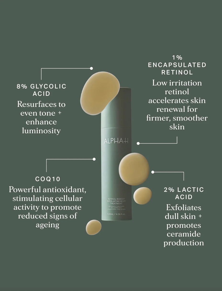 This 4-in-1 formula combining 1% Encapsulated Retinol, 8% Glycolic Acid, 2% Lactic Acid and antioxidant-rich CoQ10 accelerates skin renewal and boosts collagen production to firm, smooth, reduce redness and brighten body skin.