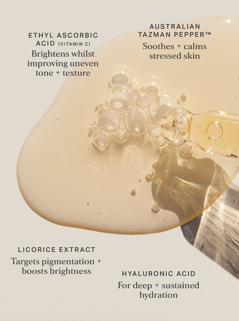 HERO INGREDIENTS: 10% Ethyl Ascorbic Acid, Hyaluronic Acid, Grape Seed Extract, Liquorice Root Extract, Australian Tazman Pepper™