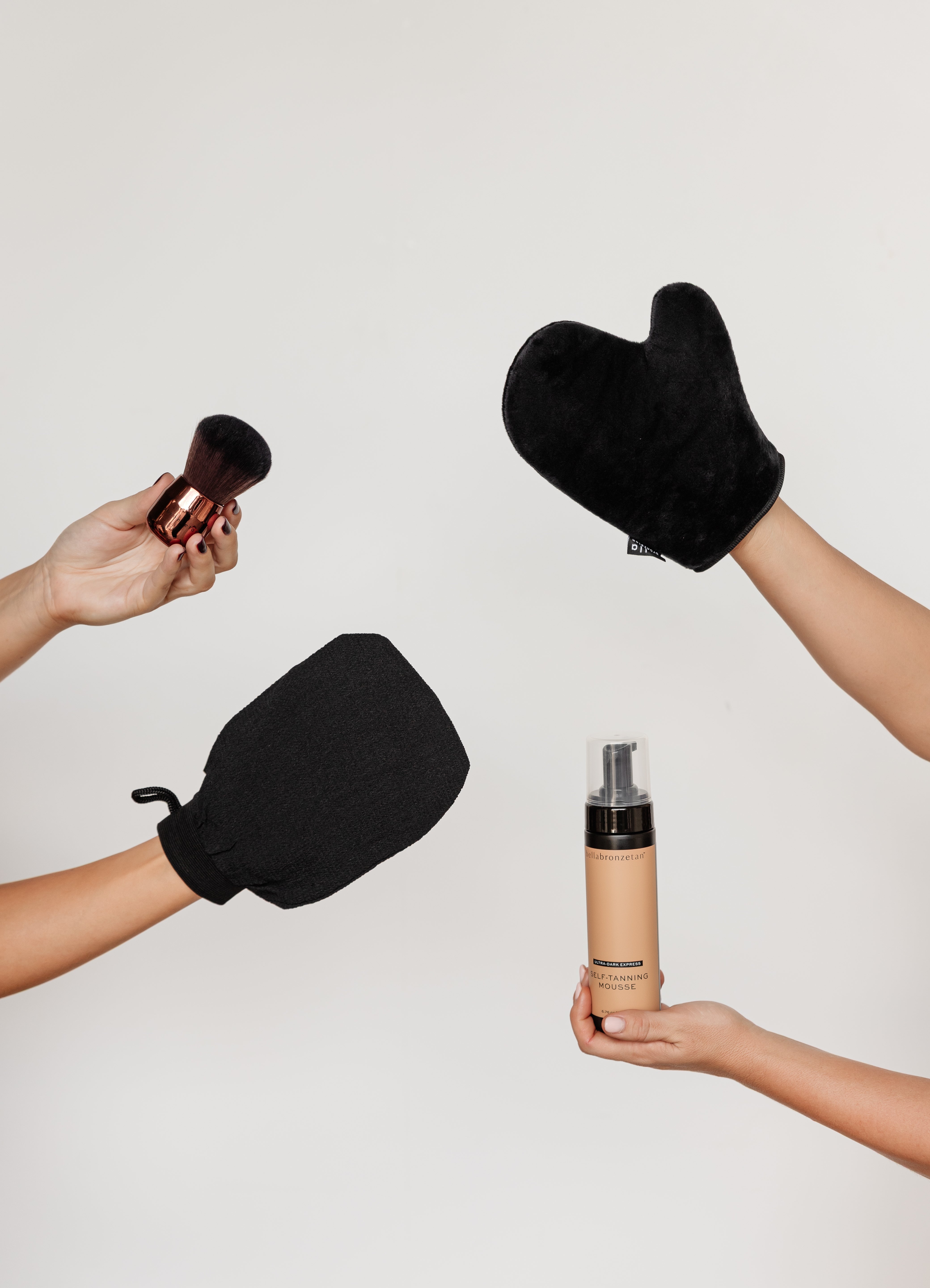 We recommend our luxe tanning brush to blend and buff your self-tanning mousse flawlessly into those tricky areas such as your hands, feet, collarbone and even your face!